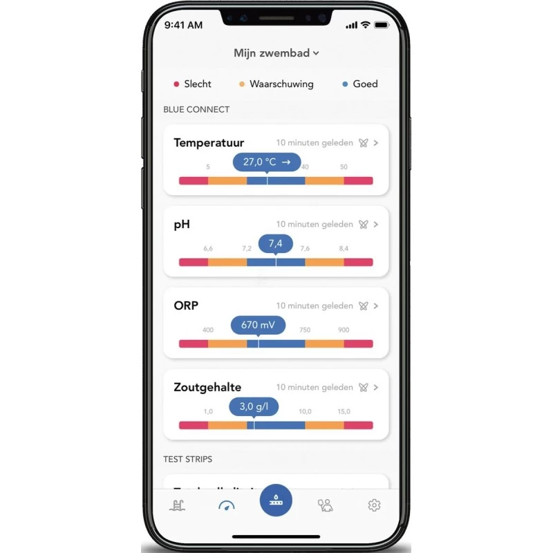Deze gratis app is op iOS en Android apparaten te downloaden. Via deze app leest u de belangrijkste parameters van de waterkwaliteit van uw zwembad af, zoals de temperatuur, het zoutgehalte en de pH- en ORP/REDOX waarde. De ORP/Redox waarde geeft u inzicht op het ontsmettingsvermogen van het water. Vervolgens geeft de app in stappen aan wat u moet doen om de waarden goed te krijgen en te behouden. Met de Blue Connect PLUS zout watertester krijgt u een Blue Expert Modus abonnement, zodat u nog meer gegevens af kunt lezen. Zo krijgt u via het abonnement ook weersinformatie. Daarnaast heeft u de mogelijkheid om terug te kijken naar eerdere metingen.