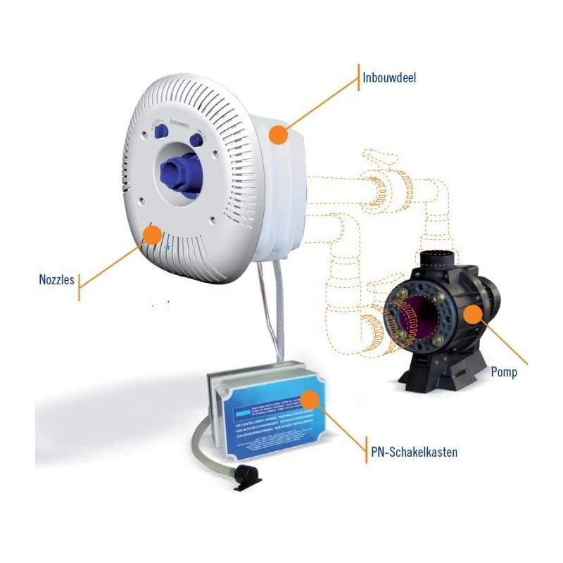 Jetstream ECO. Geleverd inclusief: frontpaneel voorzien van nozzle, inbouwdeel voor betonnen baden, pomp en PN-besturingskast.