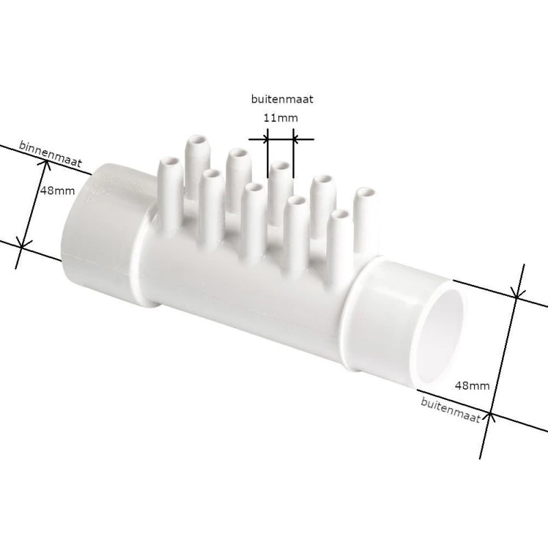 De 10 kleine aansluitingen zijn bedoeld voor leidingen van 3/8 inch. Deze leidingen hebben een binnenmaat van 10 mm. en schuiven over de aansluitingen van het spruitstuk heen, die een buitendiameter van 11 mm. hebben. Niet gebruikte aansluitingen kunnen afgedopt worden met een kunststof dop.