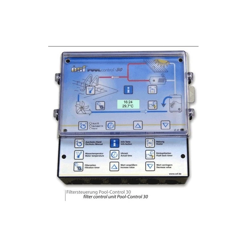 Besturing voor automatische/handmatige filtratie en verwarming.