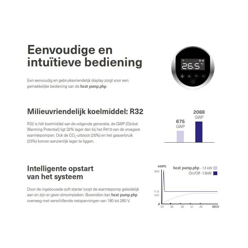 De innovatieve Poool php warmtepomp is één van de meest stille en energiezuinige op de markt. De warmtepomp maakt gebruik van een van de beste invertertechnologieën op de markt, wat een slimme regeling van zowel de compressor, de ventilatormotor als het druksysteem mogelijk maakt. Met haar “Back-discharge design” word de lucht zijdelings aangezogen en langs de achterzijde uitgeblazen en is elk mogelijk geluid gedempt. Alle types zijn voorzien van een ingebouwde wifi module.