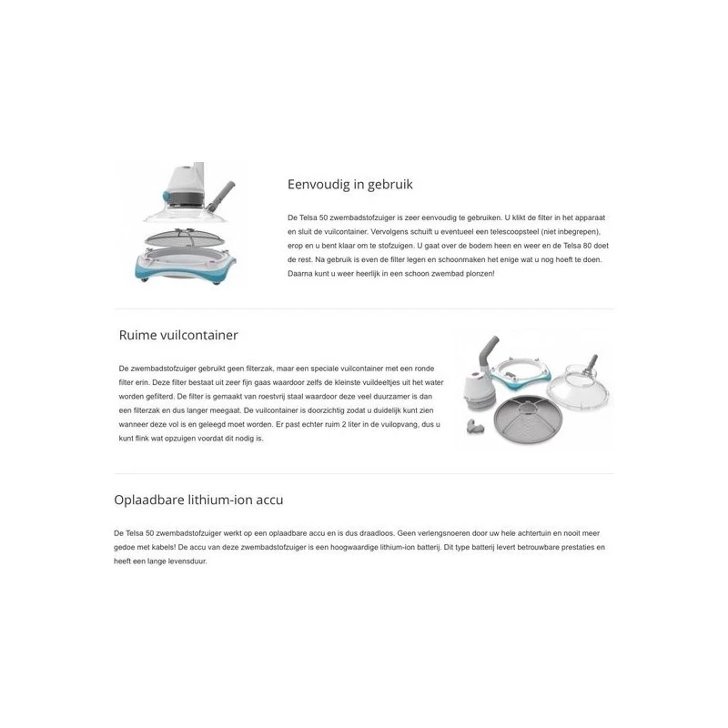 De Telsa 80 elektrische accu zwembadstofzuiger kan in kleine tot grote zwembaden gebruikt worden (tot 50 m³). Dankzij het ergonomische handvat ligt de stofzuiger goed in de hand waardoor hij ook nog eens comfortabel te gebruiken is. Er wordt tevens een speciaal koppelstuk meegeleverd waaraan je eventueel een telescoopsteel (niet inbegrepen) kunt bevestigen. Dan kun je zelf buiten het zwembad blijven staan en toch overal bijkomen. Speciale openingen aan de zijkant van de Telsa 80 elektrische accu zwembadstofzuiger laten het water er snel uit lopen wanneer je de stofzuiger na gebruik uit het water tilt. Handig, want hierdoor is hij gelijk een stuk minder zwaar en makkelijker te dragen.
