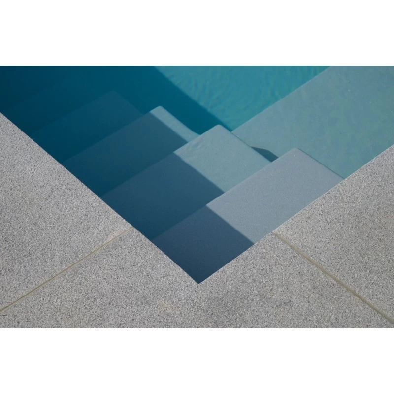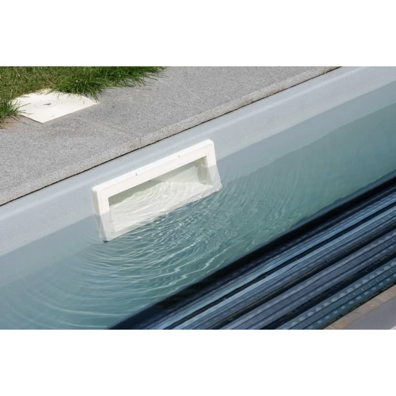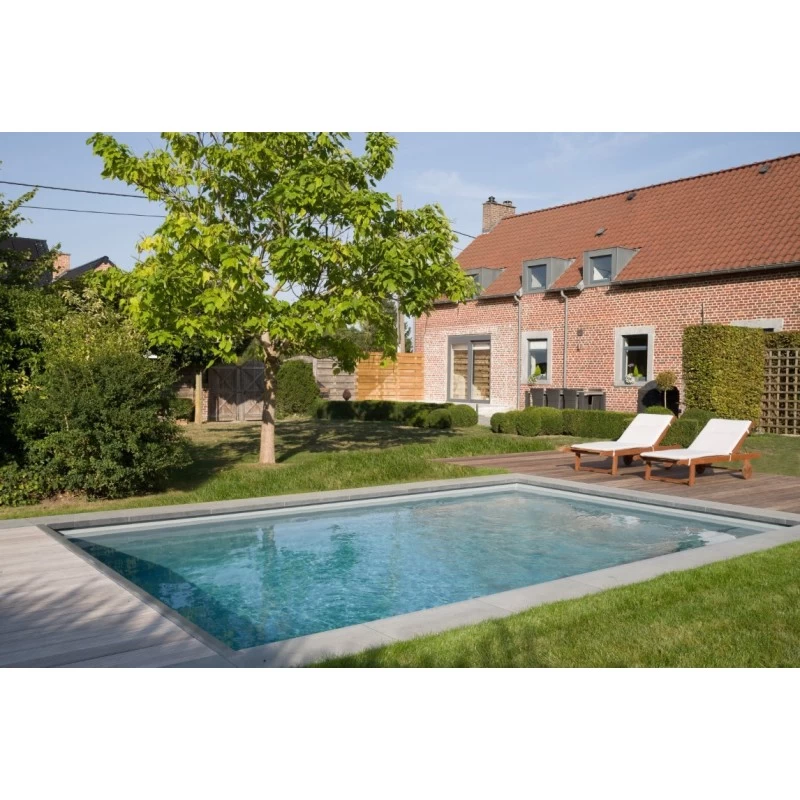Dit monoblokzwembad is ook beschikbaar met een geïntegreerde zwembadafdekking en heeft eveneens een rechte trap met 5 treden., een strak design die zich overal goed integreert.